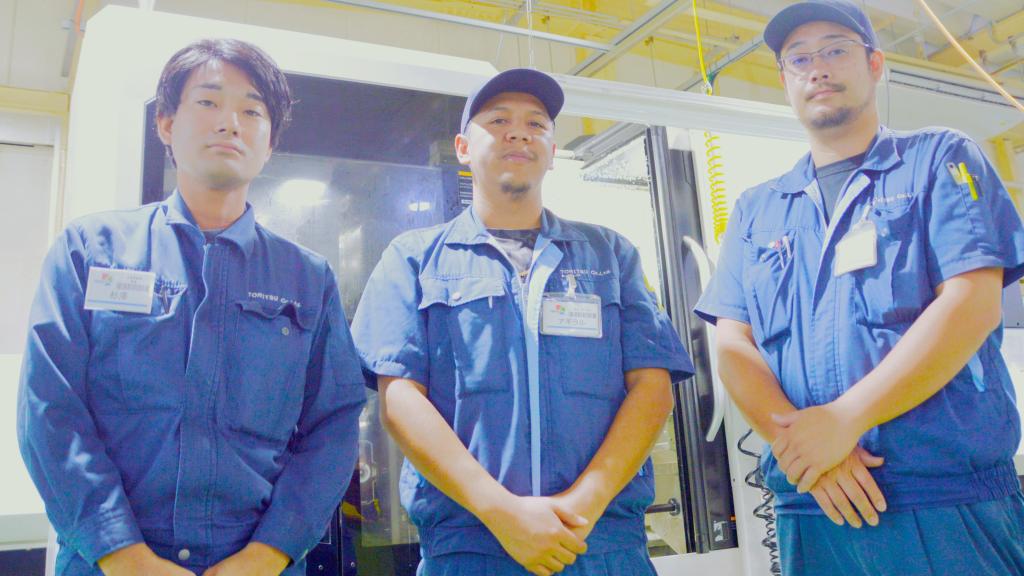 東立製作所(日高市)の技術力を支えるのは製造部の杉澤大輔さん(左)アギラル タカヨシさん(中)桒山(くわやま)武士さん(右)の3人だ。杉澤さんは難加工ワークの技術的サポートを、アギラルさんと桒山さんはMC、NC旋盤部門のリーダーとして部門のマネジメントを担当。「工場の生産金額向上のため自動化を進めたい」と一致団結している。