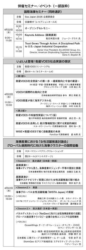 会期中は最新の製品・技術・研究を紹介する多彩なプログラムが開かれる。オープニングセレモニーとともに、ジョージ・グラス駐日米国大使による基調講演を行う国際海事セミナーや、業界トップが集う「Sea Japan フォーラム」(有料)など100を超えるセッションが予定されている。詳細は公式ホームページへ。