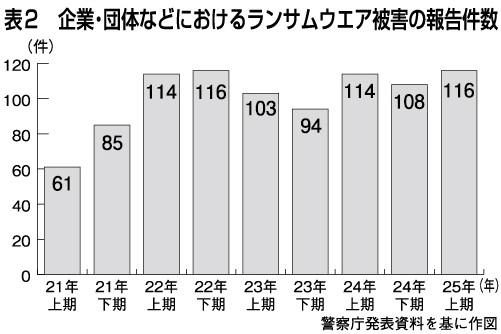 警察庁が9月に発表した資料によると、1—6月の上期に国内で発生したランサムウエア被害報告件数は116件。半期の件数としては2022年下期と並び最多となった(表2)。そのうち77件を中小企業が占め、対策が比較的手薄な中小企業が狙われやすい傾向となっている。
