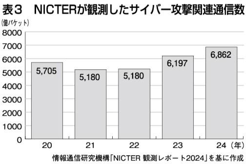 サイバーセキュリティー技術の研究開発に取り組む情報通信研究機構(NICT)のサイバーセキュリティ研究所では、サイバー攻撃を大規模に観測・分析するNICTERプロジェクトを推進し、05年から観測を続けている。今年2月にまとめた「NICTER観測レポート2024」によると、24年のサイバー攻撃関連通信数は23年比11%増の約6862億パケットとなり、4年連続で増加した(表3)。このうち、海外組織からの調査目的と見られるスキャンの割合が約6割を占め、インターネットにつながるIoT機器や脆弱性を狙った調査が盛んに行われている。“探される側”のリスクが高まる中、IoT機器などが攻撃の踏み台とされないようIT資産の脆弱性管理が重要となる。