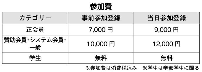 参加費は事前参加登録と当日参加登録で異なる。事前参加登録は正会員が7000円(消費税込み)、賛助会員・システム会員・一般が1万円(同)。当日参加登録は正会員が9000円(同)、賛助会員・システム会員・一般が1万2000円(同)。学生(学部学生に限る)は事前・当日ともに無料。事前参加登録は9月29日まで。