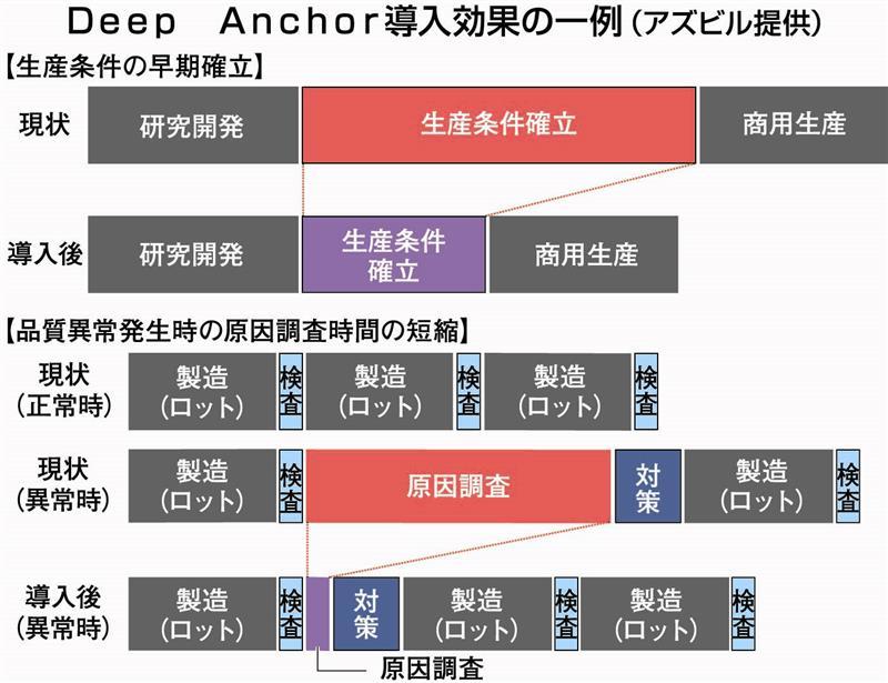 Deep AnchorはQMS(品質マネジメントシステム)の重要パートを代行するAIシステムで、品質問題の解消、新製品の早期市場投入を加速する。品質に影響を与える因子を自動で抽出し、生産中の因子の変化を常に監視する。品質検査で不合格が発生した際には、その原因を自動で調べて報告する機能を備える。