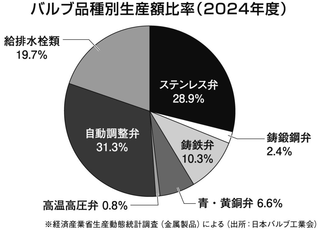 バルブ生産額を品種別にみると自動調整弁が1792億円と最も多く、次いでステンレス弁が1659億円、給排水栓類が1130億円となっており、上位3品目で約8割を占める。ステンレス弁は15年と比べて2・4倍に成長しており、高機能・高付加価値製品へのニーズ増を表している。